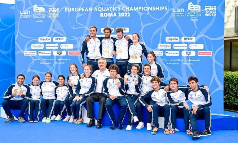 I gemelli diversi dell’Italtuffi fanno sognare anche nell’ultima giornata dei XXXVI campionati europei di Roma, rendendola un’happy end.Lorenzo Marsaglia e Giovanni Toccisi esaltano anche nel sincro esono d’argento con 387.51; davanti agli alfieri italiani ci sono solo i britanniciJack Laugher e Anthony Harding– vice campioni del mondo in carica – con 412.83; terzi sono gli ucrainiOleg Kolodiy e Oleksandr Horshkovozovcon 384.39.Routine di ottimo livello degli azzurri,addirittura primi doppio salto mortale e mezzo avanti con 2 avvitamenti carpiato(84.66) a metà gara; unica pecca in chiusura l’ingresso leggermente sporcato in ingressodel triplo salto mortale e mezzo avanti raggruppato(63.24). Non è però il momento dei rimpianti, ma di godersi l’ennesima medaglia, la dodicesima di un’Italtuffi incontenibile e da record. La gara di Marsaglia e Tocci.L’ordinario indietro carpiato(52.80) e ilrovesciato carpiato(43.20) sono puliti e il sincro piuttosto buono.Gli azzurri dopo gli obbligatori sono terzi con 96.00. Davanti i britanniciJack Laugher e Anthony Harding con 97.80, poi gli ucraini Oleg Kolodiy e Oleksandr Horshkovozov con 66.20. Il triplo salto mortale e mezzo avanti carpiato(71.61) è eccellente, con Tocci che recupera da manuale una partenza forse anticipata:sempre terzi con 167.61; britannici avanti con 183.48 e ucraini secondi con 172.50.Il doppio salto mortale e mezzo avanti con 2 avvitamenti carpiatoè da standing ovation: due corpi in uno (84.66) e azzurri primi con 252.27,scavalcati britannicisecondi con 247.74, seguiti dagli ucraini con 245.97;quarti i tedeschi Timo Barthel e Mortiz Wesemanncon 243.80. Quinta routine tutta da vivere.Il doppio salto mortale e mezzo ritornato carpiato(72.00) è uno scoglio superato da campioni e con la giusta freddezza.Giovanni e Lorenzo arrivano a 324.27.Il quadruplo avanti e mezzo raggruppato di Laugher e Harding è superlativo (84.36) e inglesi che tornano avanti ma questa volta con margine (332.10). Ucraina a 310.95.Ultimo round palpitante: iltriplo salto mortale e mezzo avanti raggruppato(63.24) è buonissimo nel sincronismo ma l’ingresso di Marsaglia è scarso. La coppia azzurra chiude con 387.51, quanto basta per prendersi l’argento, non per l’oro vinto meritatamente dai britannici Laugher e Harding con 412.83; Kolodiy e Horshkovozov sono di bronzo con 384.39. Le parole di Giovanni Tocci.“E’ stata una bella gara, sapevamo che i britannici erano forti. Ci abbiamo creduto e questa volta stiamo insieme sul podio e sullo stesso gradino. Credo che con una prova perfetta gli inglesi si potevano battere, ma non sarebbe stato così semplice”. Le parole di Lorenzo Marsaglia. “Un europeo da premiare con un voto più alto del dieci, forse la lode. Sono stati giorni indimenticabili, esaltanti e nei quali siamo stati trascinati sempre da un pubblico caloroso”. LARSEN QUARTO DAI 10 MT.Nessun rimpianto, solo la consapevolezza che il futuro è dalla sua parte.Andreas Sargent Larsen chiude al quarto posto con 417.20 puntila finale dalla piattaforma che chiude il programma dei XXXVI campionati europei. L’oro è del fenomeno ucraino Oleksii Sereda con 493.55, l’argento e il bronzo dei britannici Noah Williams con 459.00 e Ben Cutmore con 438.35. Nono l’altro azzurro Eduard Timbretti con 333.85.Ottima la finale del 23enne italodanese– tesserato per Fiamme Oro e CC Aniene, seguito da Benedetta Molaioli e oro nel Team Event –impreziosita da uno strepitoso doppio salto mortale e mezzo avanticon 2 avvitamenti carpiato (74.25) e da un super triplo salto mortale e mezzo rovesciato raggruppato (73.10). La gara di Larsen e Timbretti.Dopo le prime due routineLarsen è terzo con 145.20punti con il triplo salto mortale e mezzo indietro raggruppato e il doppio salto mortale (70.95) e mezzo avanti con 2 avvitamenti carpiato (74.25);Timbretti è ottavocon 118.85 punti il triplo salto mortale e mezzo ritornato raggruppato (51.20) e il verticale con triplo salto mortale indietro raggruppato (67.65).Comnada il britannico Noah Williams con 159.00, seguito dall’ucraino Sereda con 145.65; quarto è il tedesco Jordan Eikeramnn con 135.00.Poi Andy si esibisce in un bel triplo salto mortale e mezzo rovesciato raggruppato(73.10) e rimane terzo con 218.30 punti; mentre Eduard sbaglia la chiusura del triplo salto mortale e mezzo rovesciato raggrupato (39.10) ed è decimo con 157.95. In testa c’è Sereda con 224.85, poi Williams a 218.40; quarto l’altro britannico Cutmore con 217.10. Quarta routine come sempre la più delicata.Larsen si esibisce nella verticale con triplo salto mortale indietro raggruppato: la verticale è tenuta alla perfezione e la chiusura pulita (72.80);Timbretti reagisce alla grande con un ottimo, in tutte e tre le fasi,triplo salto mortale e mezzo avanti carpiato(67.50). Andreas è terzo a 290.90; Eduard ottavo con 225.45. Scappa Sereda (313.95), Williams supera i trecento (304.80); quarto “pericoloso” è Cutmore con 290.60.Penultimo round.Il triplo salto mortale e mezzo ritornato raggruppato di Larsen(56.00) è aperto in ritardo: è quarto con 346.90, davanti a lui c’è Cutmore con 361.55. Il triplo salto mortale e mezzo indietro raggruppato di Timbretti è scarso in ingresso (39.80): è undicesimo con 265.05. Ultimo giro come sempre thriller.Timbretti risale al nono postocon un buon doppio salto mortale e mezzo indietro con un avvitamento e mezzo (63.80) e finisce con 333.85. Larsen si esibisce con un pulitissimo quadruplo salto mortale e mezzo avanti raggruppato (70.30): i 417.20 punti non bastano per il bronzo che è di Cutmore con 438.35. Vince Sereda con 493.55; argento a Williams con 459.00