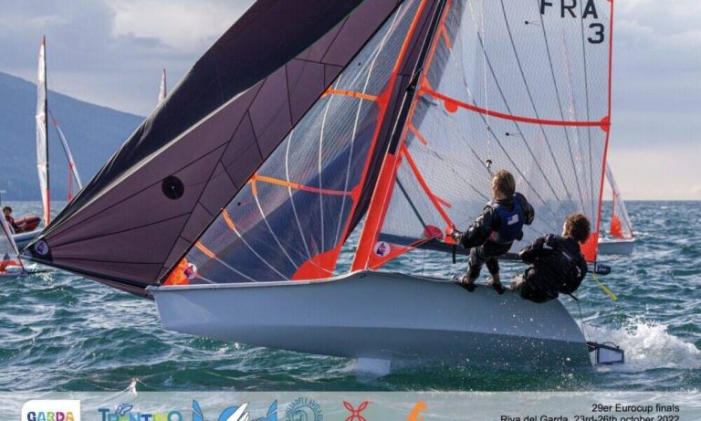 Iniziate con una bella giornata di sole e vento da nord le fasi finali della 29er Eurocup, manifestazione internazionale organizzata dalla Fraglia Vela Riva, che registra il record di iscritti con 150 equipaggi provenienti da 17 nazioni, e che si concluderà mercoledì 26 ottobre a Riva del Garda. Il Comitato di Regata FIV ha dato la partenza puntuale alle 10:00, riuscendo a far concludere quattro belle e appassionante regate per la flotta gold, che con 77 equipaggi al via ha regatato sempre con vento disteso sui 10-16 nodi. La flotta gold è approdata alle finali portandosi il punteggio netto con cui hanno chiuso le sei regate di qualifica, a cui da oggi si è aggiunto il punteggio delle singole prove di finale. Il podio sembra si giochi tra Italia e Francia, con l’inserimento del primo equipaggio misto irlandese, che rimane nelle primissime posizioni. Attualmente perfetta parità di punteggio tra i francesi Tom Gordon con a prua Maël Clochard e gli italiani Alex Demurtas (Fraglia Vela Riva) con a prua Giovanni Santi (SC Garda Salò). Più regolari oggi i primi, nonostante un diciasettesimo scartato, compensato però da un 2-1-3; posizioni che hanno permesso di rosicchiare quei 5 punti che gli italiani avevano come vantaggio a fine qualifiche. Il timoniere Alex Demurtas ha controllato bene gli avversari, chiudendo con la sequenza di 1-16-2-8. Tre punti dietro gli altri francesi Revil-Devaux (terzi al mondiale 2022), primi nella quarta ed ultima prova di giornata. Più distaccati gli irlandesi Clementine e Nathan Steenberge, quarti con 10 punti dai terzi. Seguono gli arcensi Bellomi-Berti, penalizzati con una squalifica in partenza nella prima regata di giornata, a cui hanno reagito con un 4-8-2. Rimangono quinti e secondi under 17. Buon recupero anche per gli altri italiani Salerno-Ferrugia (Lauria Palermo) sesti assoluti. Le svedesi Zeeberg-Widestam prime donne, ventesime overall, mentre sono al secondo posto, a 5 punti, le italiane Malika Bellomi-Beatrice Conti (Circolo Vela Arco); terze le slovene Petric-Sedmak. Mercoledì la conclusione con ulteriori quattro possibili regate, con partenza anticipata alle ore 9:30. Sarà bagarre per le prime posizioni del podio, ancora tutte da giocare.